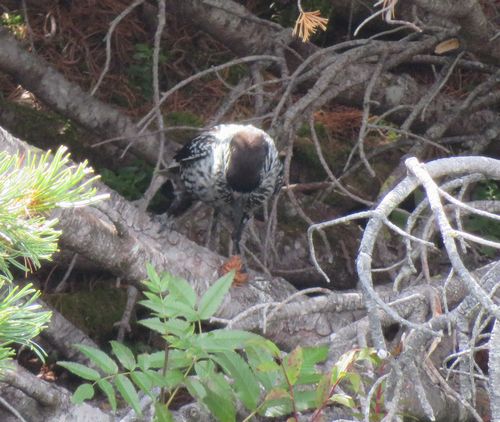 自分の隠し場所?で松ぼっくりを突いているホシガラス。
