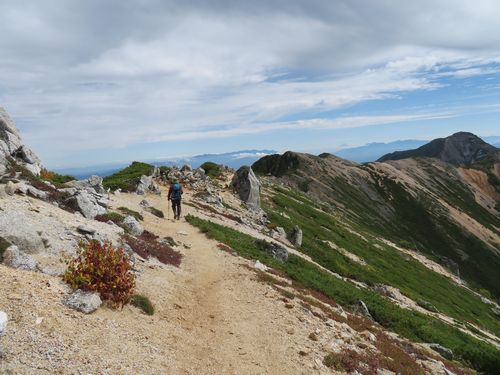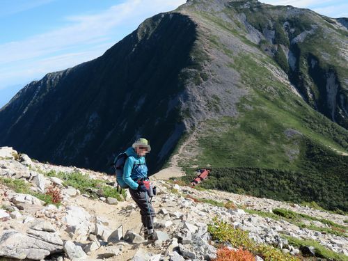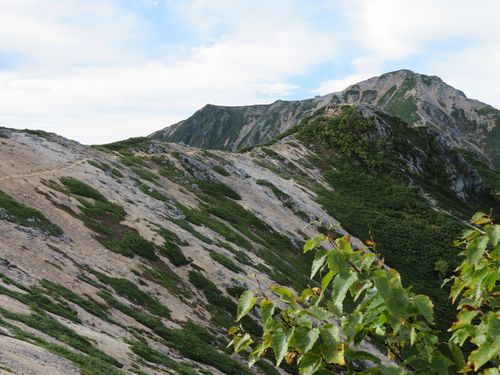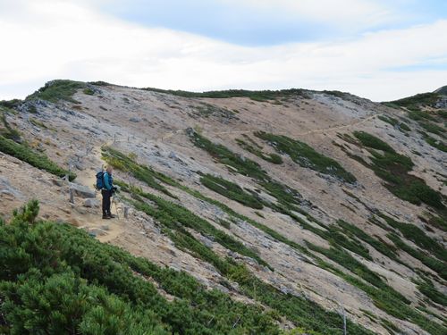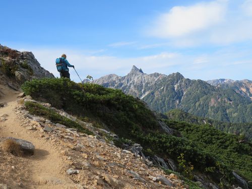 常念岳への道が見える。少し下ってから「横通岳」の山腹を巻きながら進む。