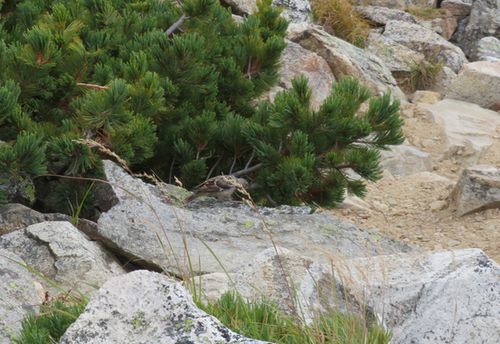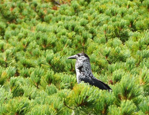 可愛い「ホシガラス」がハイマツの実をせっせと集めている。何羽も飛び交っていて