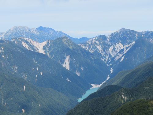 碧く見えるのは「高瀬ダム」。そこから厳しい「ブナ立て尾根」を上った事を